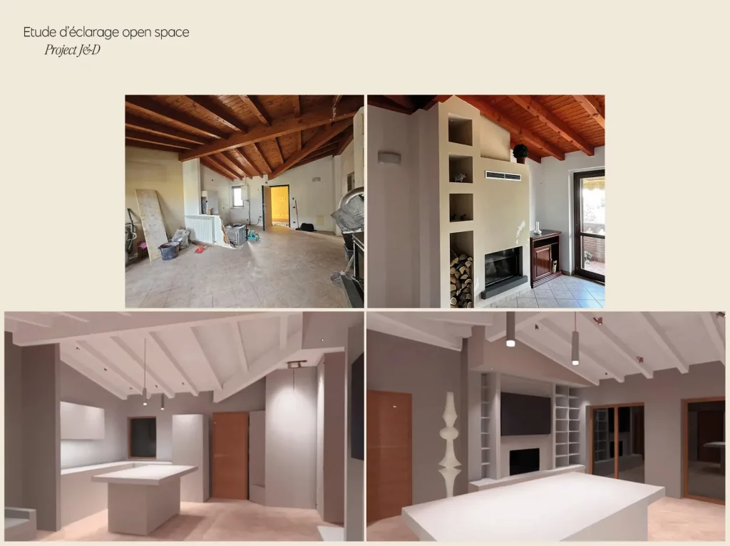 Le plafond en poutres apparentes est un élément distinctif de l'espace: il ajoute du caractère et du charme, mais l'absence d'une prédisposition pour les lumières a nécessité une étude technique approfondie. En collaboration avec un architecte spécialisé en éclairage, j'ai développé un système d'éclairage de pointe, sans compromettre l'intégrité visuelle des poutres. L'atmosphère est ainsi restée inchangée, mais l'espace est devenu à la fois accueillant et fonctionnel.